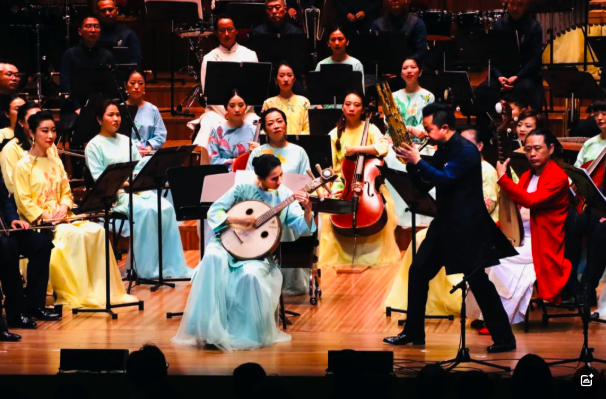 當(dāng)晚的演出由國(guó)際知名華人指揮家湯沐海執(zhí)棒,上海民族樂(lè)團(tuán)70余位演奏家一同奏響華美樂(lè)章。上半場(chǎng),竹笛與樂(lè)隊(duì)《湖光》以清麗竹音勾勒西湖粼粼波光;箏與樂(lè)隊(duì)《墨戲》在旋律中鋪展中國(guó)書法的黑白意境;琵琶、京胡與樂(lè)隊(duì)《楚漢》及二胡與樂(lè)隊(duì)《臥虎藏龍》,從經(jīng)典作品中萃取意韻;嗩吶與樂(lè)隊(duì)《鳳舞》則奏響鳳凰展翅、百鳥齊鳴的熱烈圖景。下半場(chǎng),五重奏與樂(lè)隊(duì)《卉木拾音》以微觀視角詮釋大國(guó)工匠精神;二胡與樂(lè)隊(duì)《查爾達(dá)什》將意大利作曲家維托里奧?蒙蒂的熱情旋律融入二胡炫技;民族管弦樂(lè)《絲綢之路》融合多元文化風(fēng)情,描繪神秘悠遠(yuǎn)的絲路勝景;民族管弦樂(lè)《共同家園》奏響共建地球家園的和諧主題;民樂(lè)重奏《蜂飛》改編自俄羅斯作曲家里姆斯基-科薩科夫的經(jīng)典,盡顯民族樂(lè)器的極速演奏技巧與藝術(shù)張力。整場(chǎng)音樂(lè)會(huì)在曲目編排上兼具經(jīng)典與創(chuàng)新,充分彰顯了海派民樂(lè)開放包容的藝術(shù)特色。